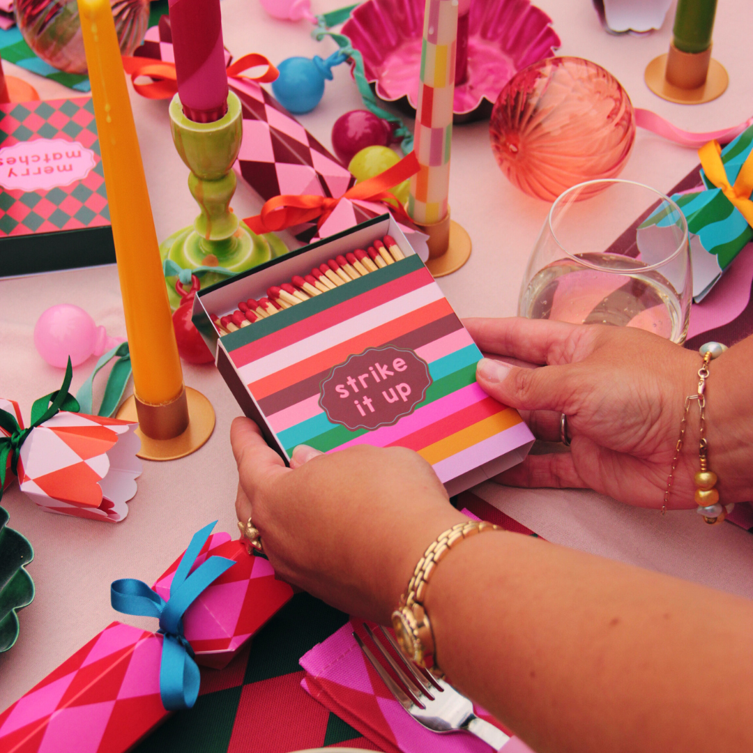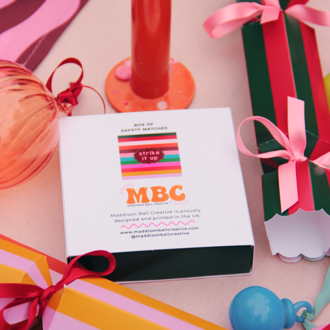 Strike It Up oversized square matchbox with red tip matches. Create the perfect giftset with an oversized matchbox, a candle & a candle holder.