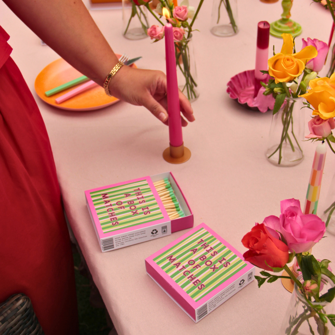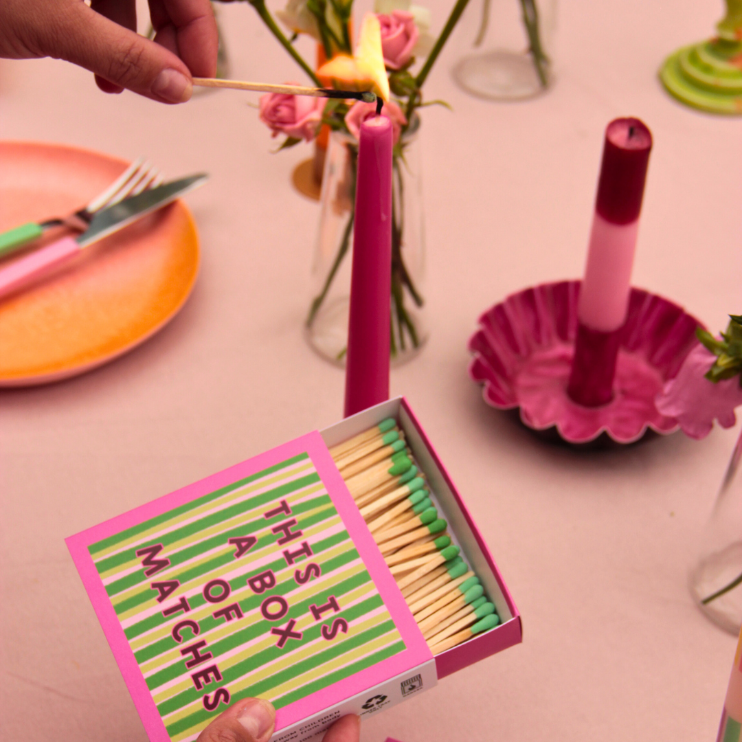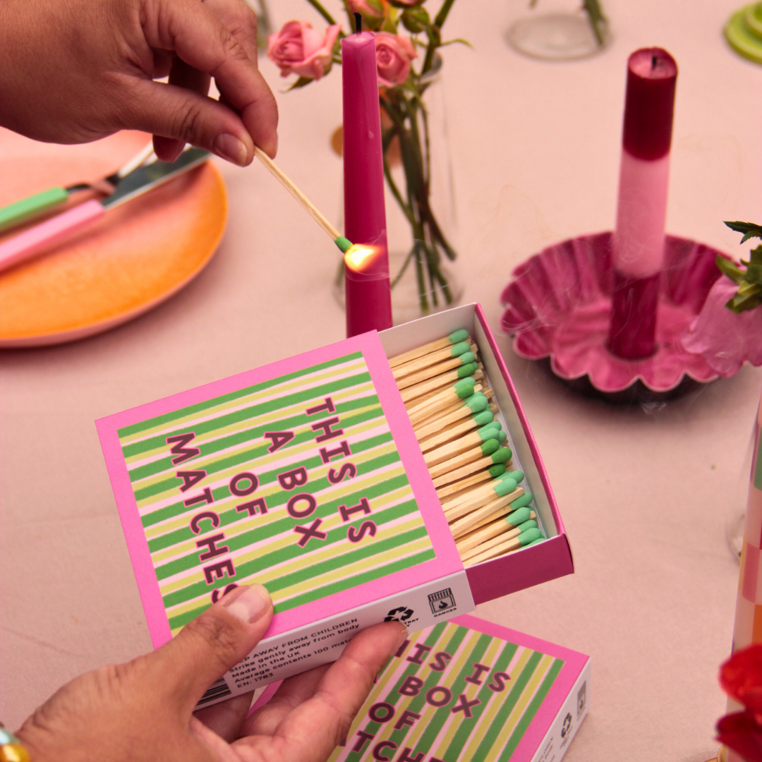 This is a Box of Matches oversized square matchbox with green tip matches. Create the perfect giftset with an oversized matchbox, a candle & a candle holder.