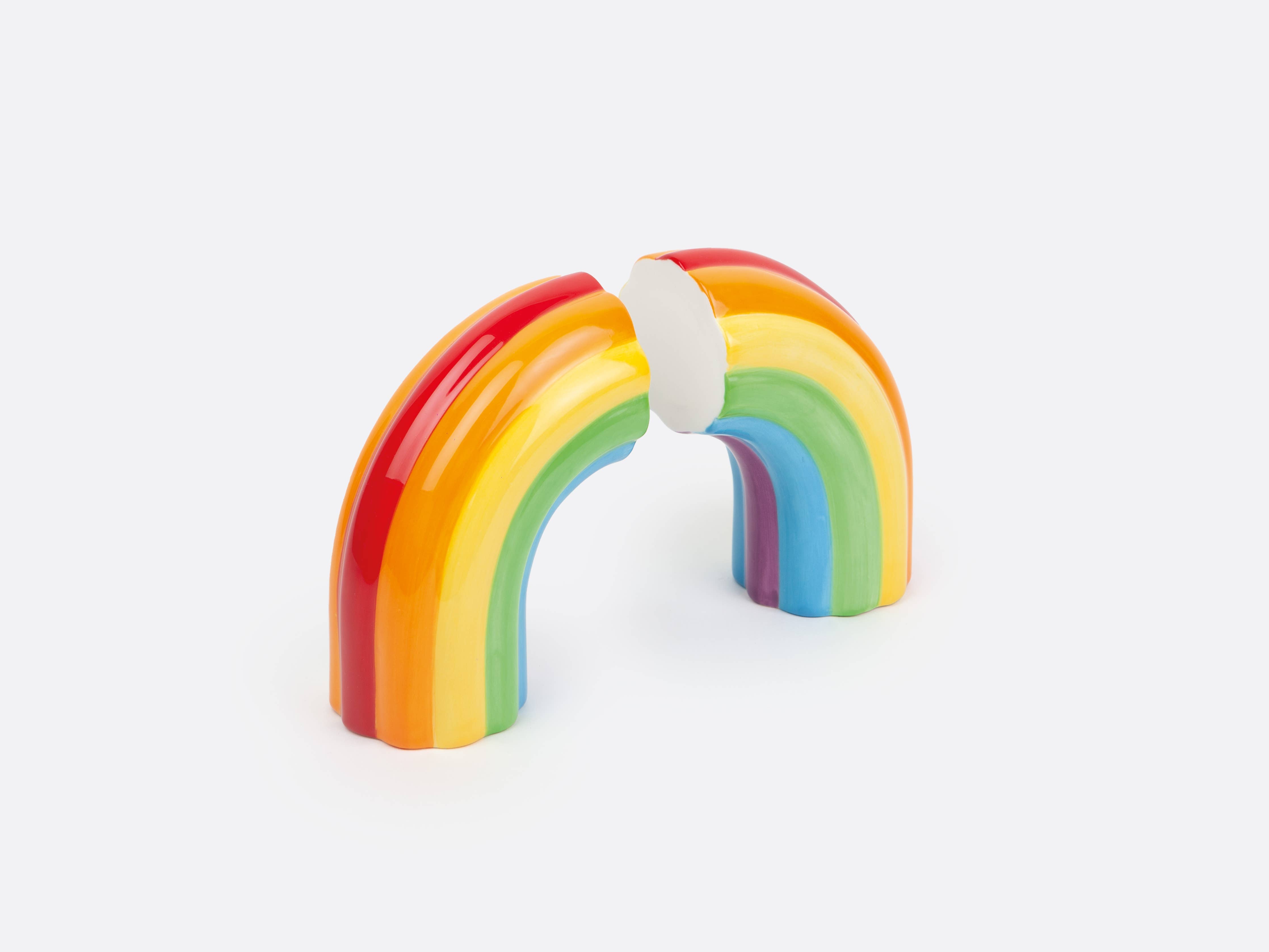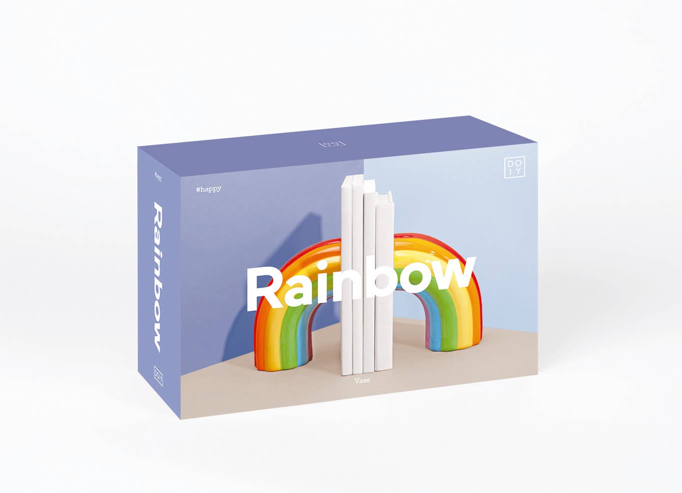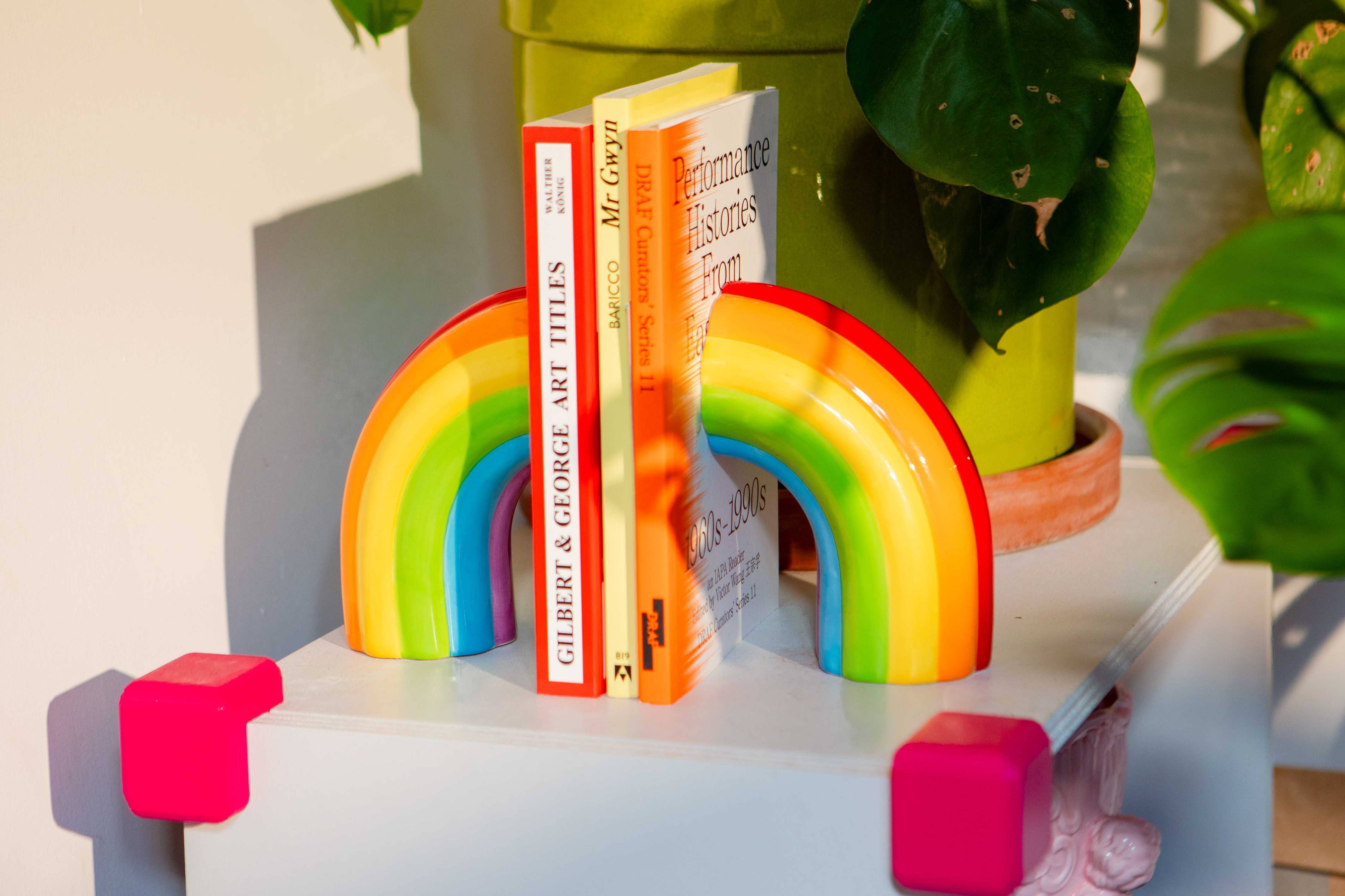 Two ceramic bookends, shaped as a rainbow, with a bumpy colorful texture that will spark joy to your home!