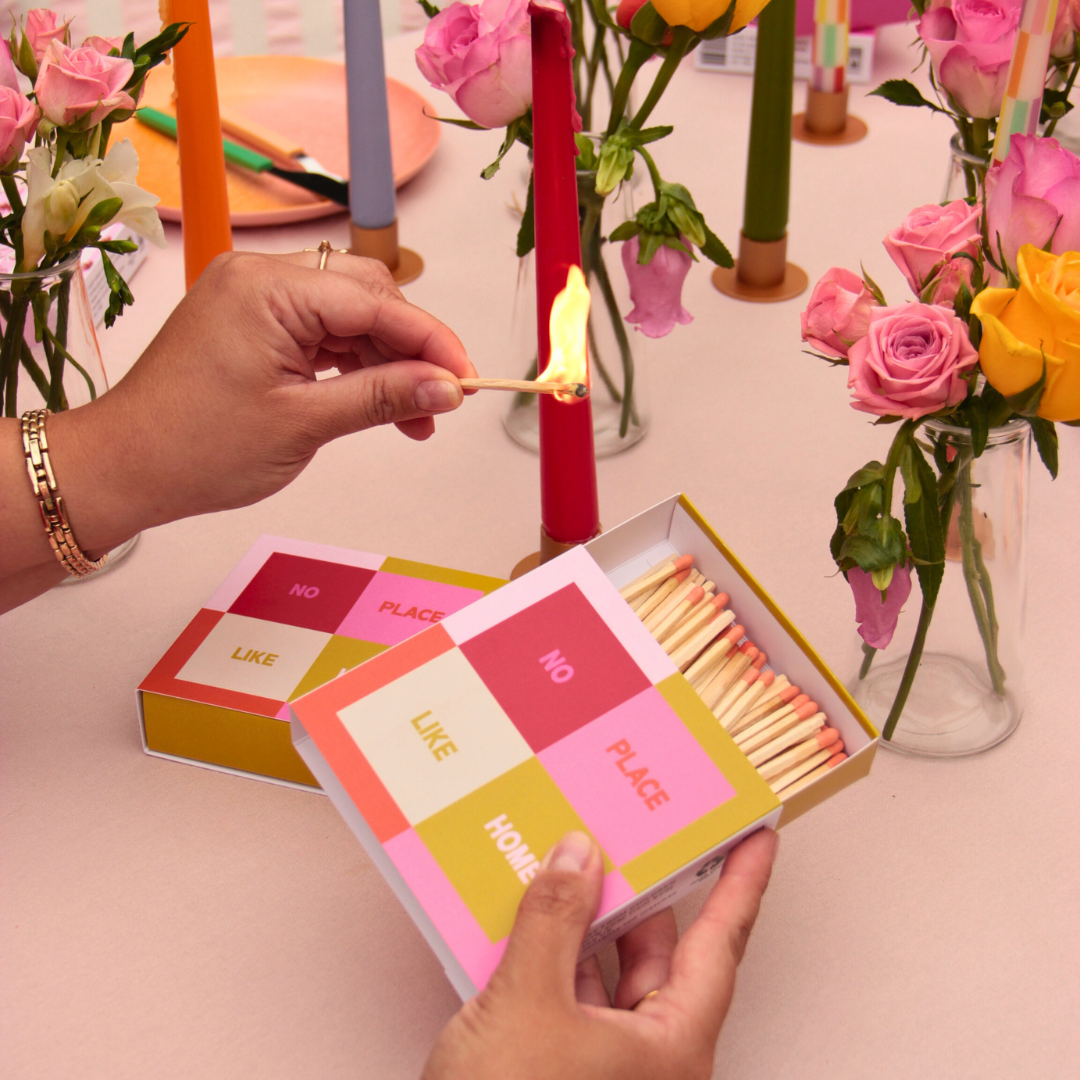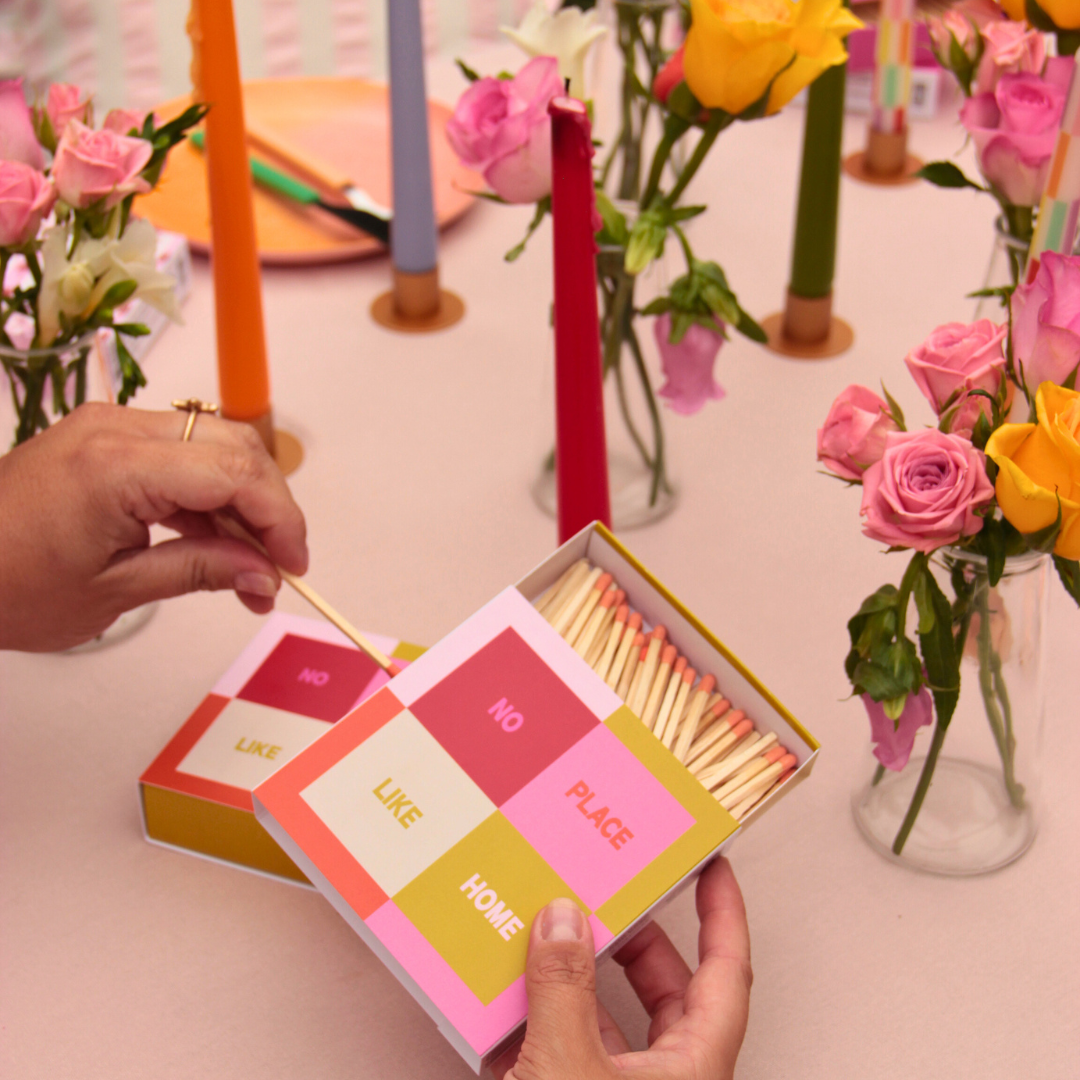 No Place Like Home oversized square matchbox with orange tip matches. Create the perfect giftset with an oversized matchbox, a candle & a candle holder.