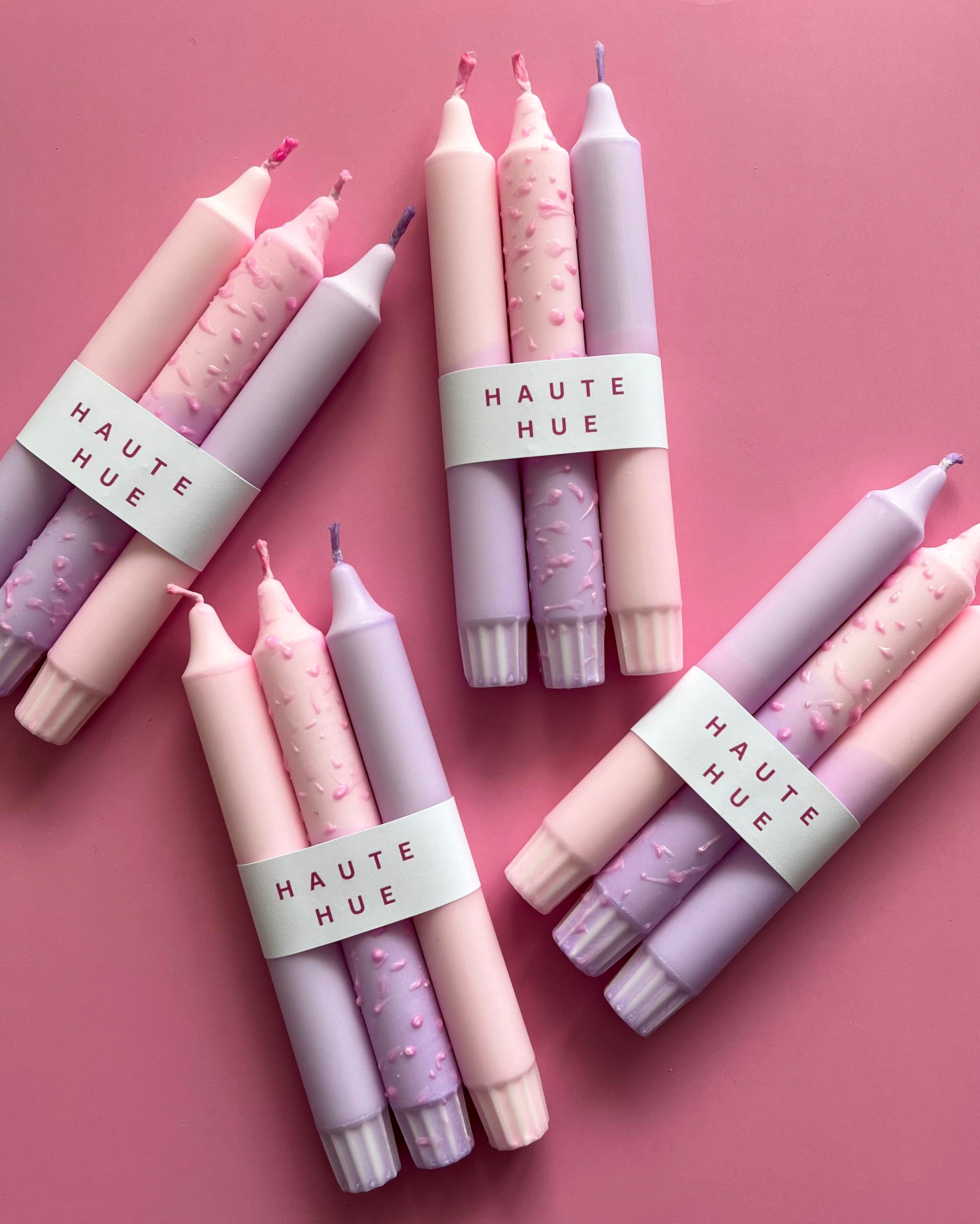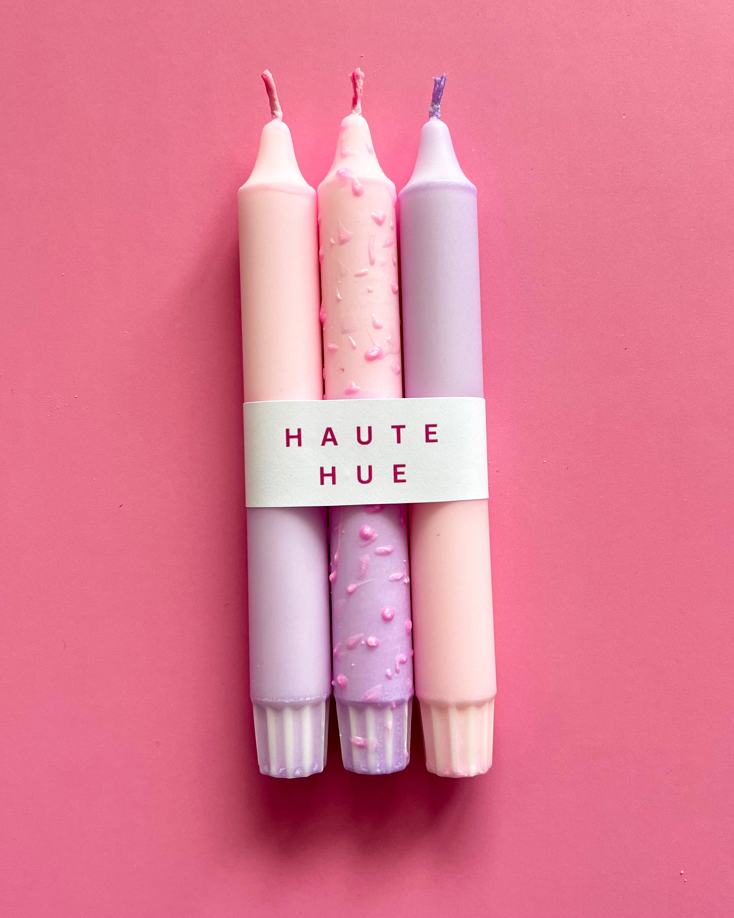 The Cotton Candy Cloud Mix blends three pastel taper candles in blush pink, lilac, and a sprinkle-textured bubblegum center candle for that perfect hit of playful charm. It’s the kind of colour palette that makes any space feel lighter, softer, and a little more magical.