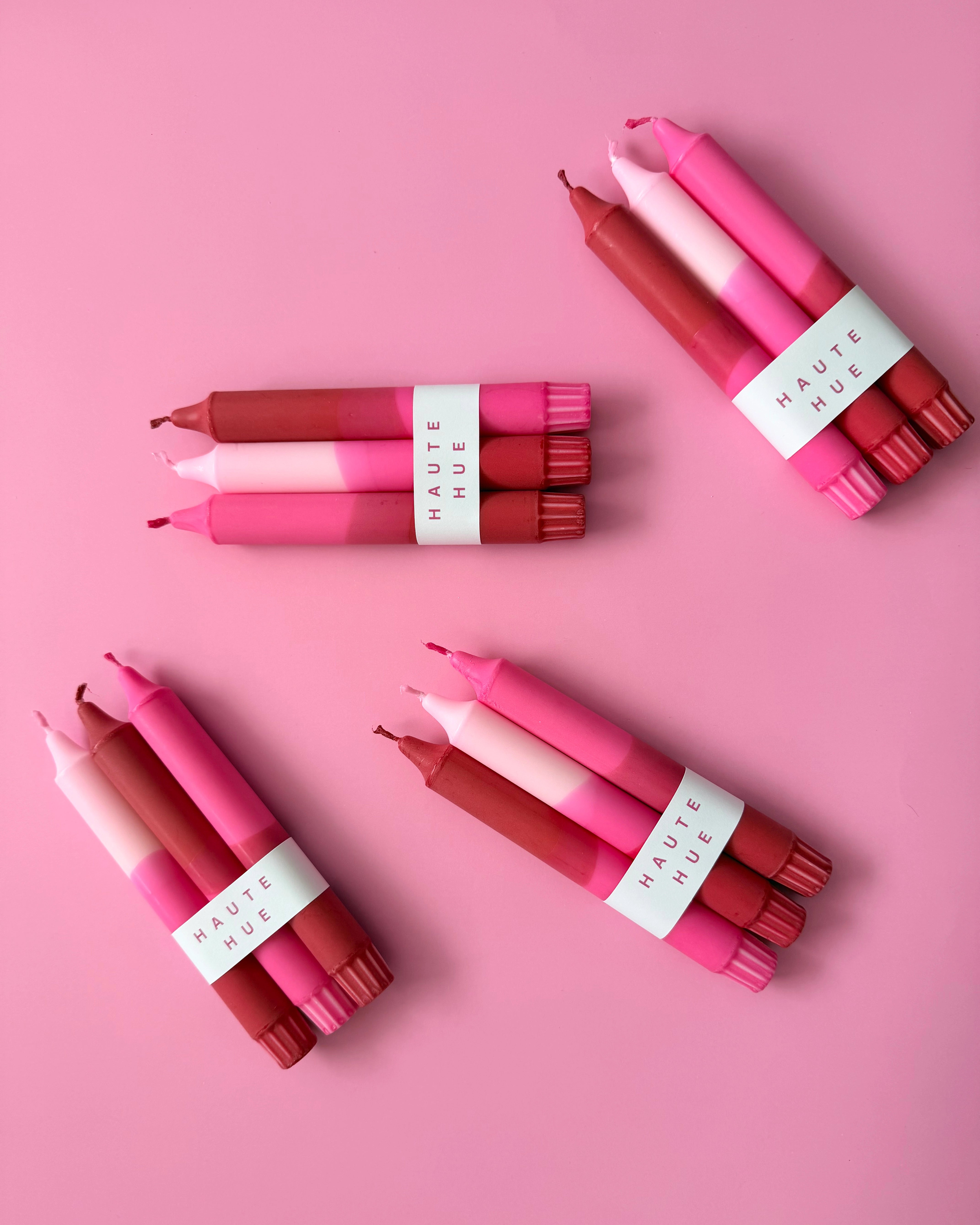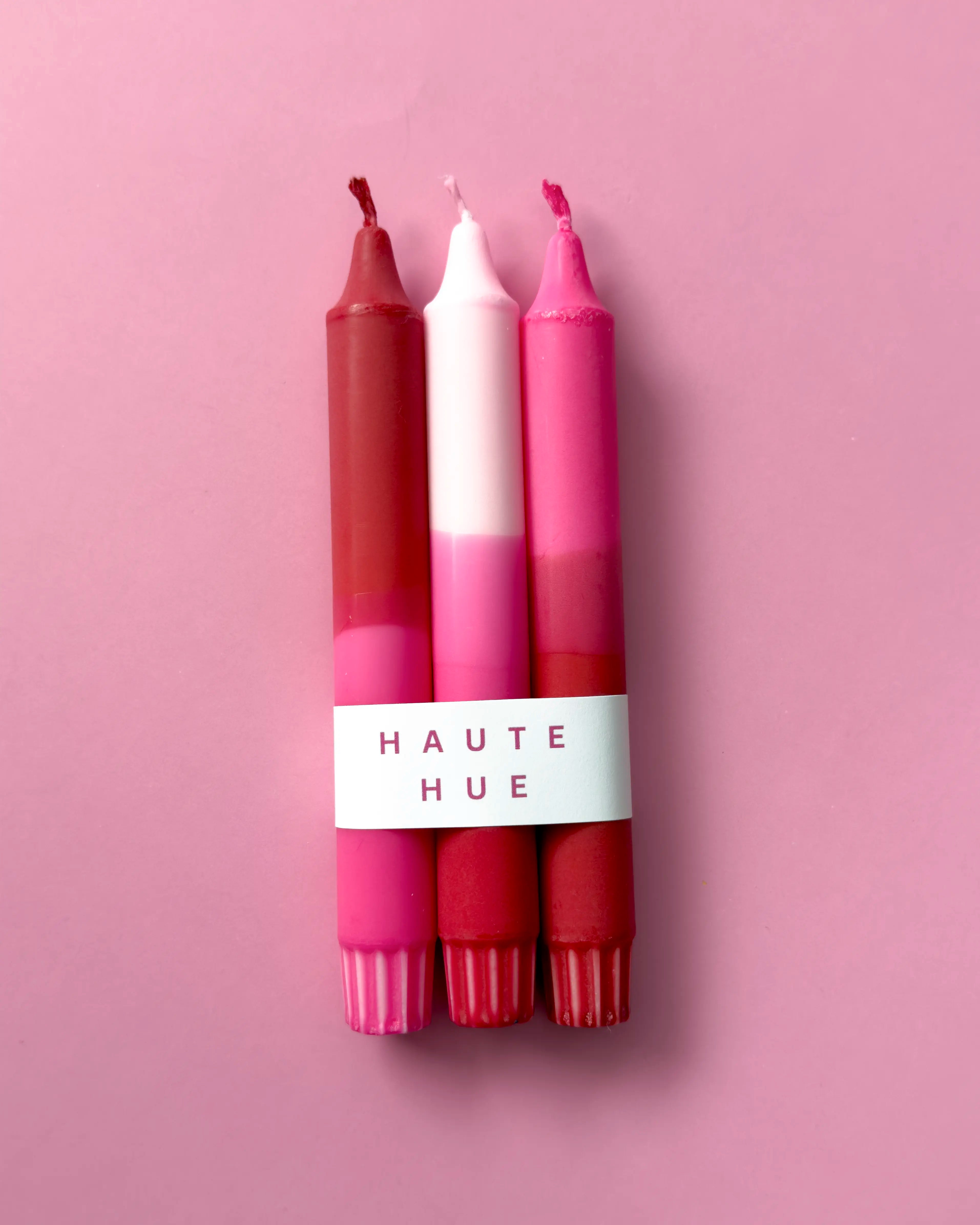 The Melina Mix Taper Candle Set includes three dip-dyed stearin wax tapers in pink and burgundy colour block layers. Inspired by one of our beloved Nana The Brand sweaters, this set channels the same colour-block fashion energy—just styled for your candle holders instead of your closet!