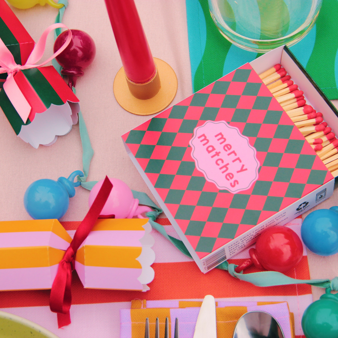 Merry Matches oversized square matchbox with red tip matches. Create the perfect giftset with an oversized matchbox, a candle & a candle holder.