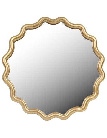 Make waves with this fun mirror! Framed in a beautiful gold finish with sculptural wave-like curves, it combines elegance with playful texture. The round shape brings balance, while the vivid frame makes it a true statement piece. Perfect for entryways, bedrooms, or living rooms, this mirror adds light, energy, and maximalist flair to your home while doubling as functional décor.