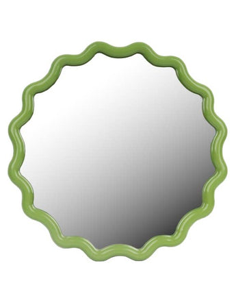 Make waves with this funky mirror! Framed in a lime green finish with sculptural wave-like curves, it combines bold colour with playful texture. The round shape brings balance, while the vivid frame makes it a true statement piece. Perfect for entryways, bedrooms, or living rooms, this mirror adds light, energy, and maximalist flair to your home while doubling as functional décor.