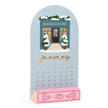 Celebrate a year of literary charm with this Book Lover’s 2026 Mini Desk Calendar! Featuring twelve months of hand-painted bookish illustrations, including cozy bookstores, seasonal book stacks, and charming literary details, this die-cut calendar is a great addition to any desk, nightstand, or reading nook. Each month is accented with gold foil lettering for an elegant touch, while the painted wooden book-shaped stand adds a classic feel to your space.