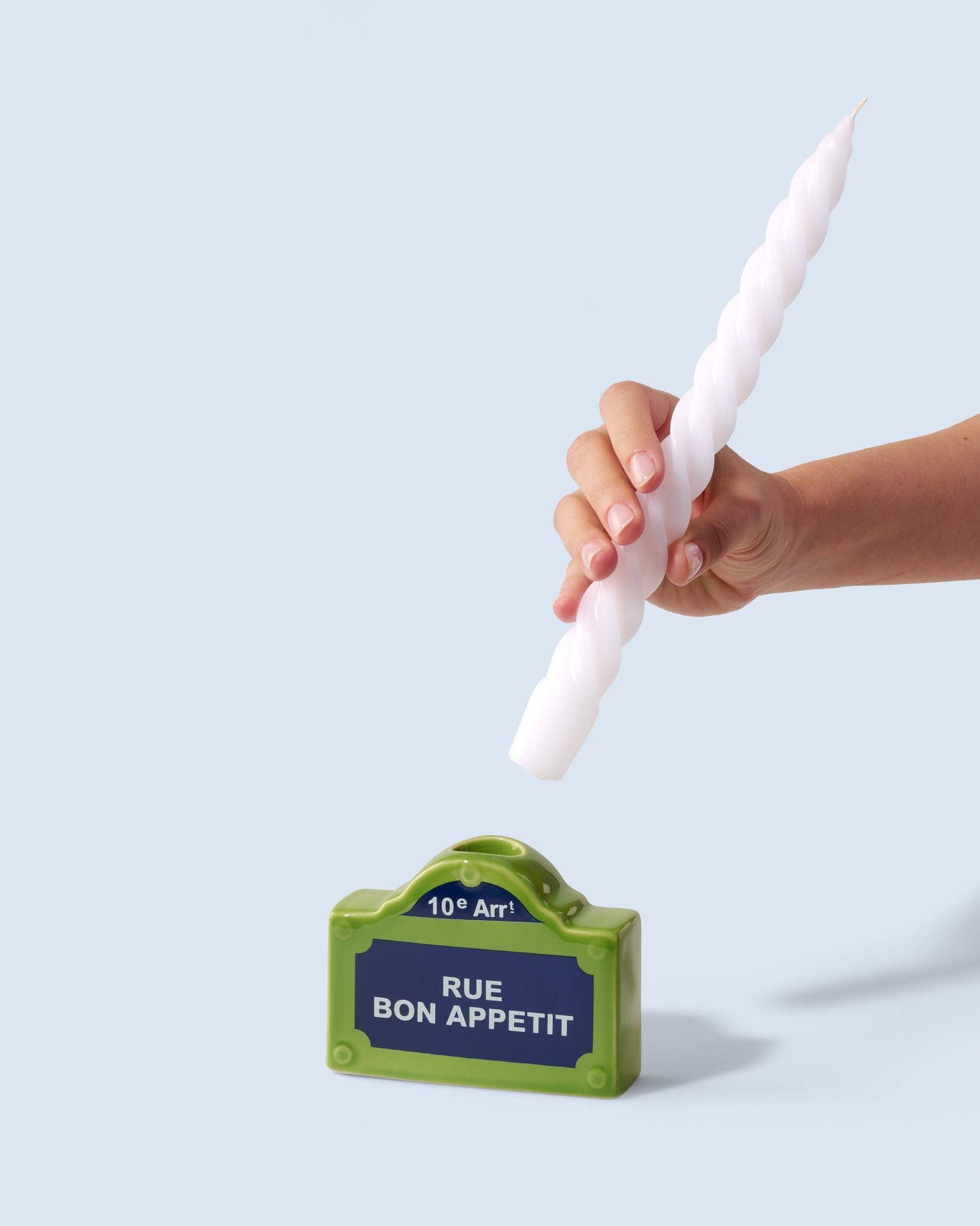Dinner looks better by candlelight—and this cheeky candle holder makes it even better. Inspired by French street signs, this playful piece features the phrase “RUE BON APPÉTIT” and holds a taper candle for an instant pop of colour and personality. Perfect for kitchen styling, tablescapes, or gifting to your favourite foodie.