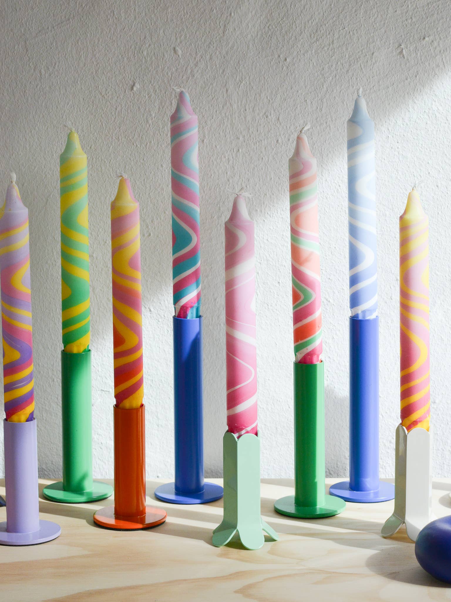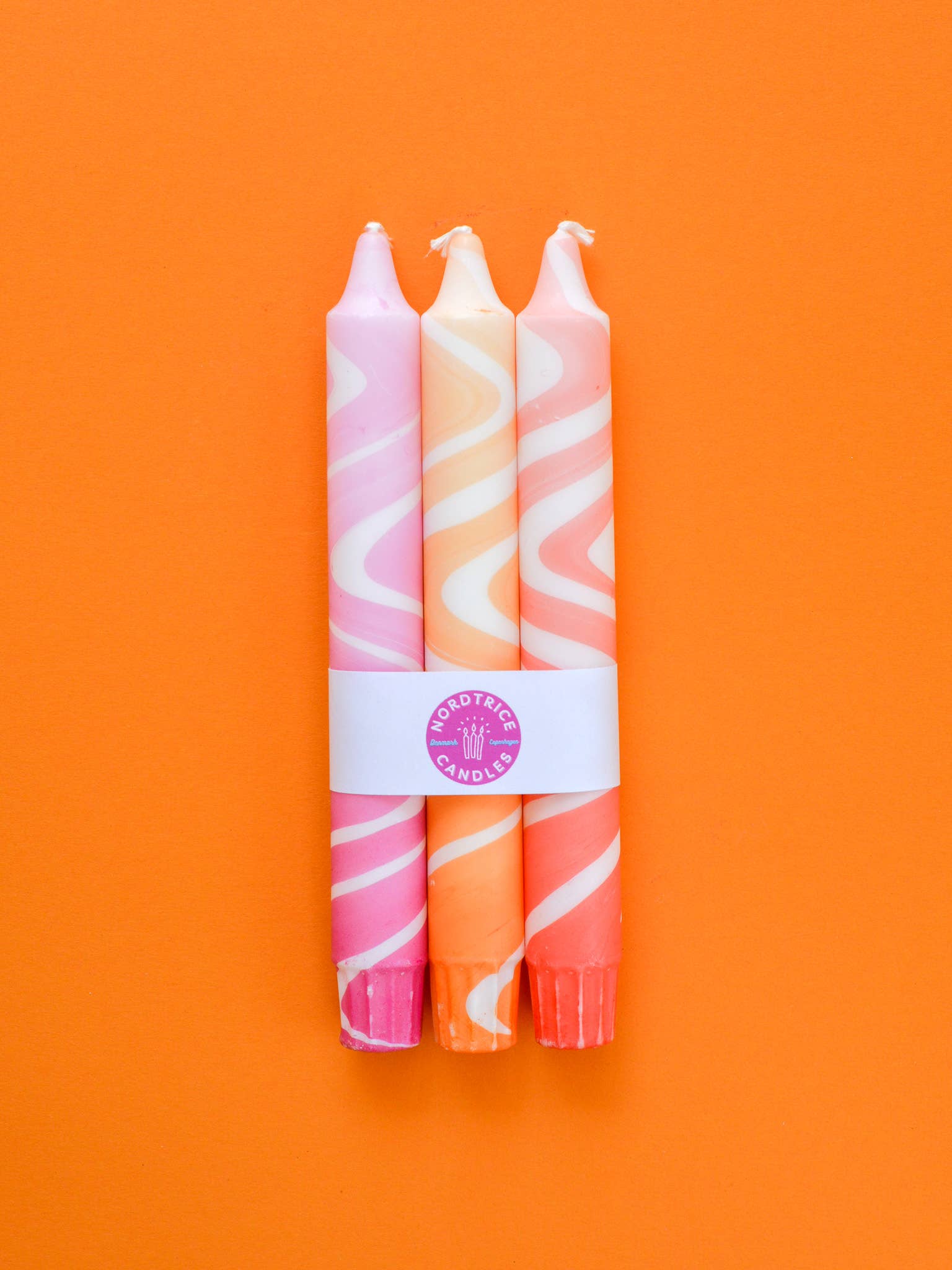 A pack of three originally hand decorated table candles. Made and designed in Scandinavian style in Copenhagen, Denmark by Nordtrice Candles.