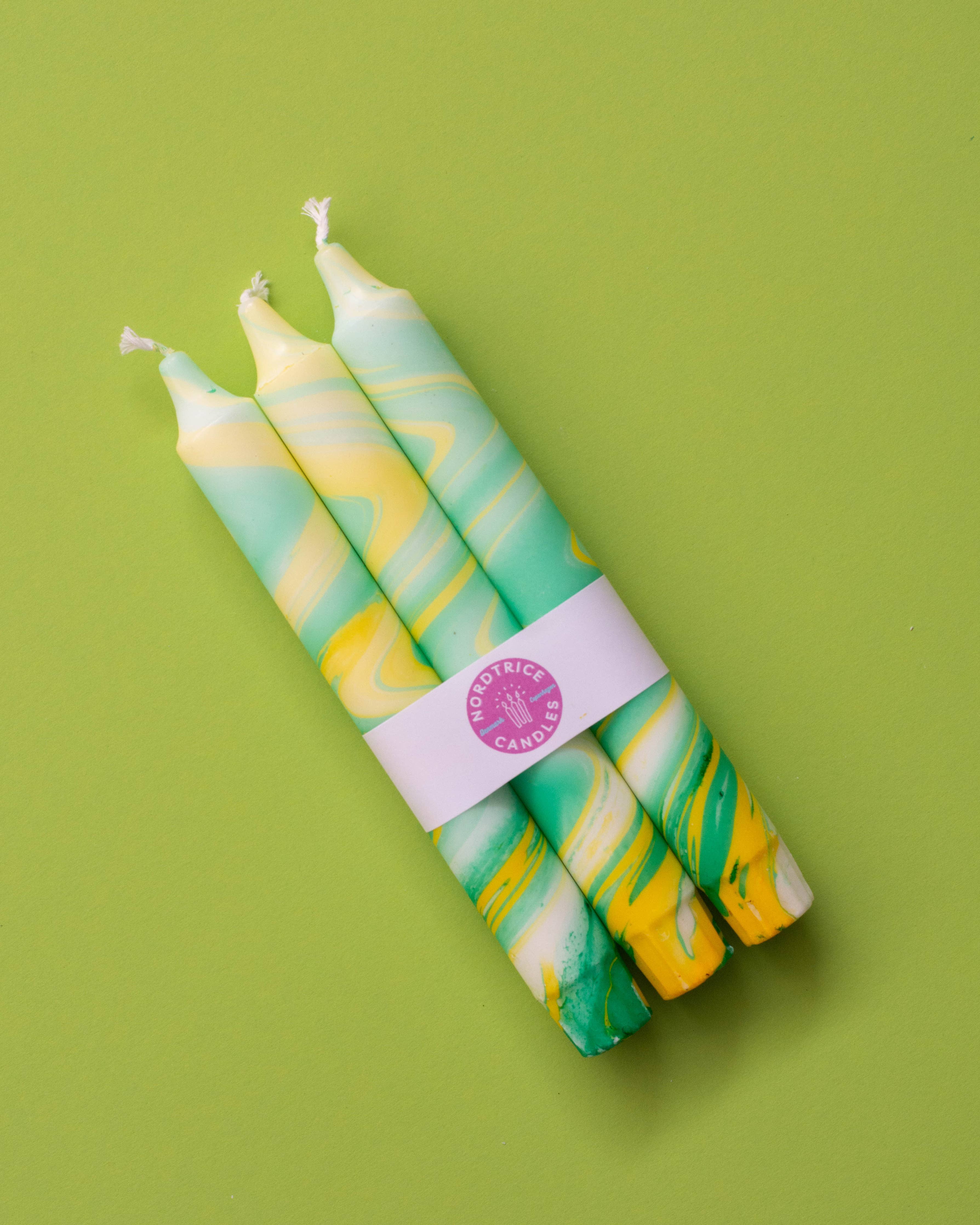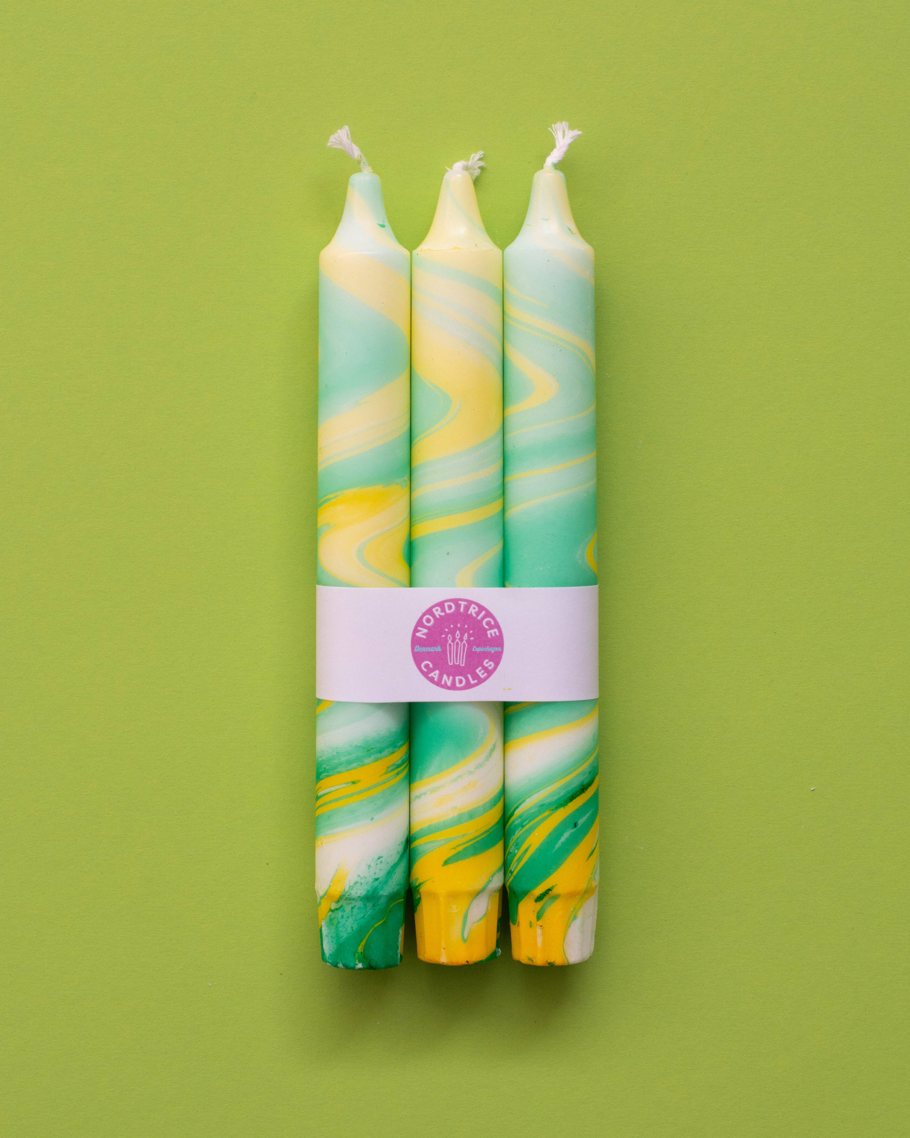 A pack of three originally hand decorated table candles. Made and designed in Scandinavian style in Copenhagen, Denmark by Nordtrice Candles.