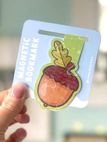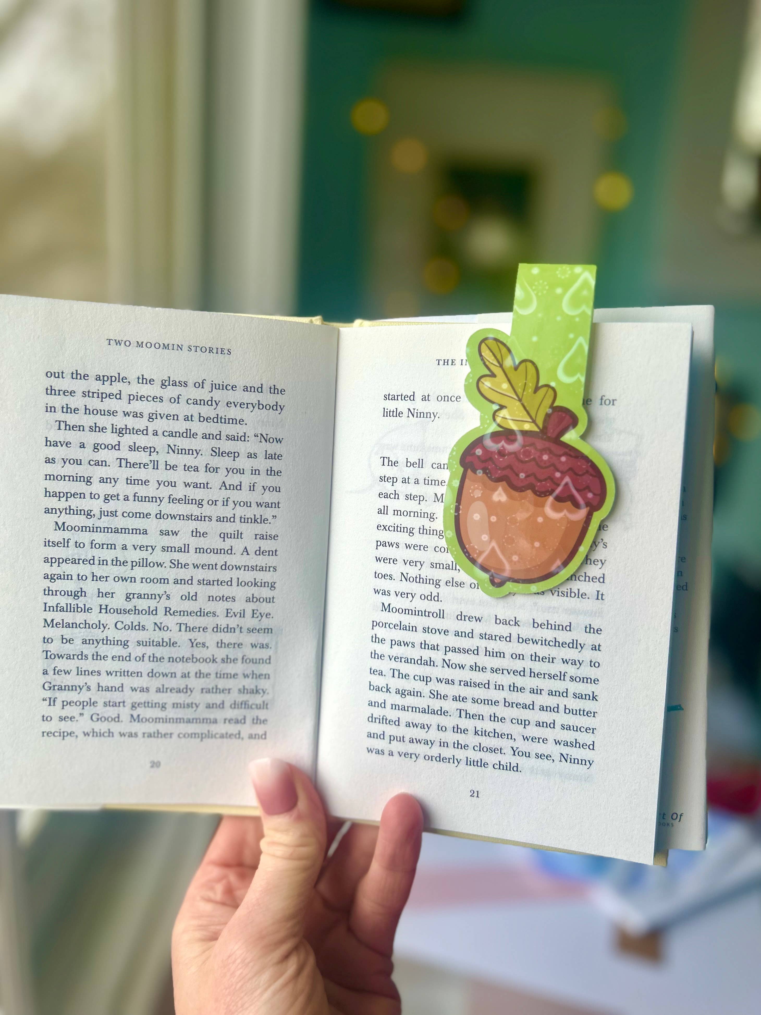 Acorn nature inspired cottage core sparkly magnetic bookmarks. The perfect small gift for book lovers.