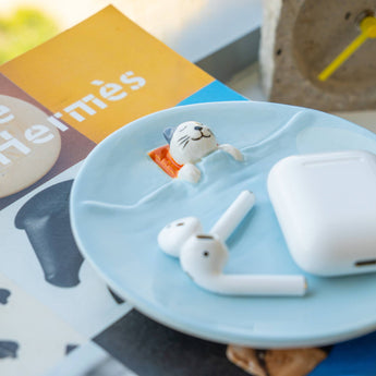 Blue trinket tray with a dreamy cat illustration, perfect for keeping jewelry or trinkets organized and within reach. Its fresh colour and delicate design add a decorative touch that stands out!