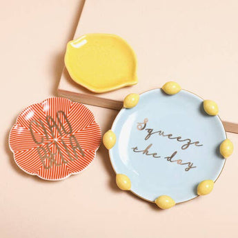 Three nesting trinket dishes with a lemon theme featuring a yellow lemon-shaped dish, a red dish with the gold lettering 'Chow Bella', and a blue and yellow 3D lemons dish with the phrase 'Squeeze the day'.