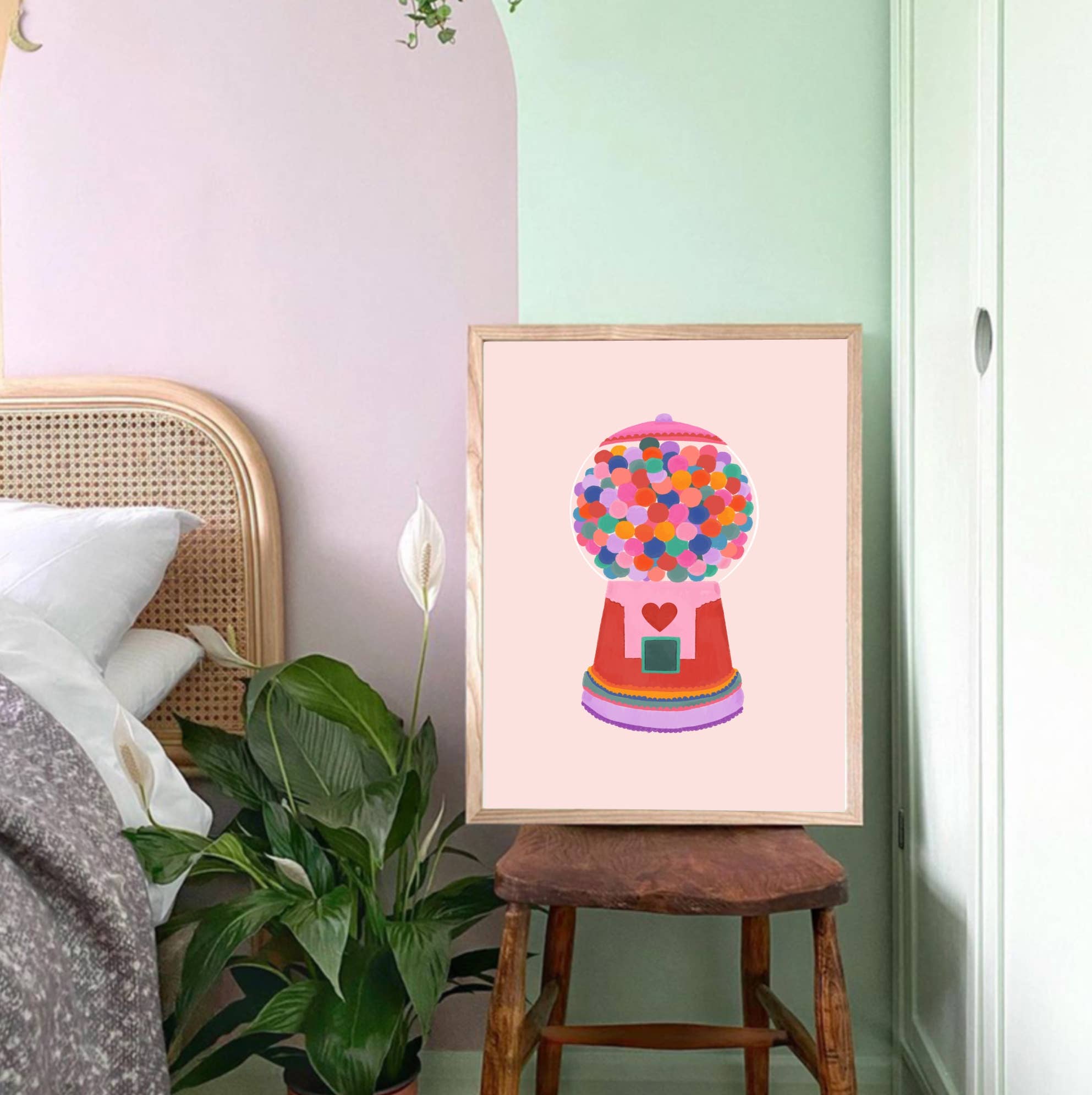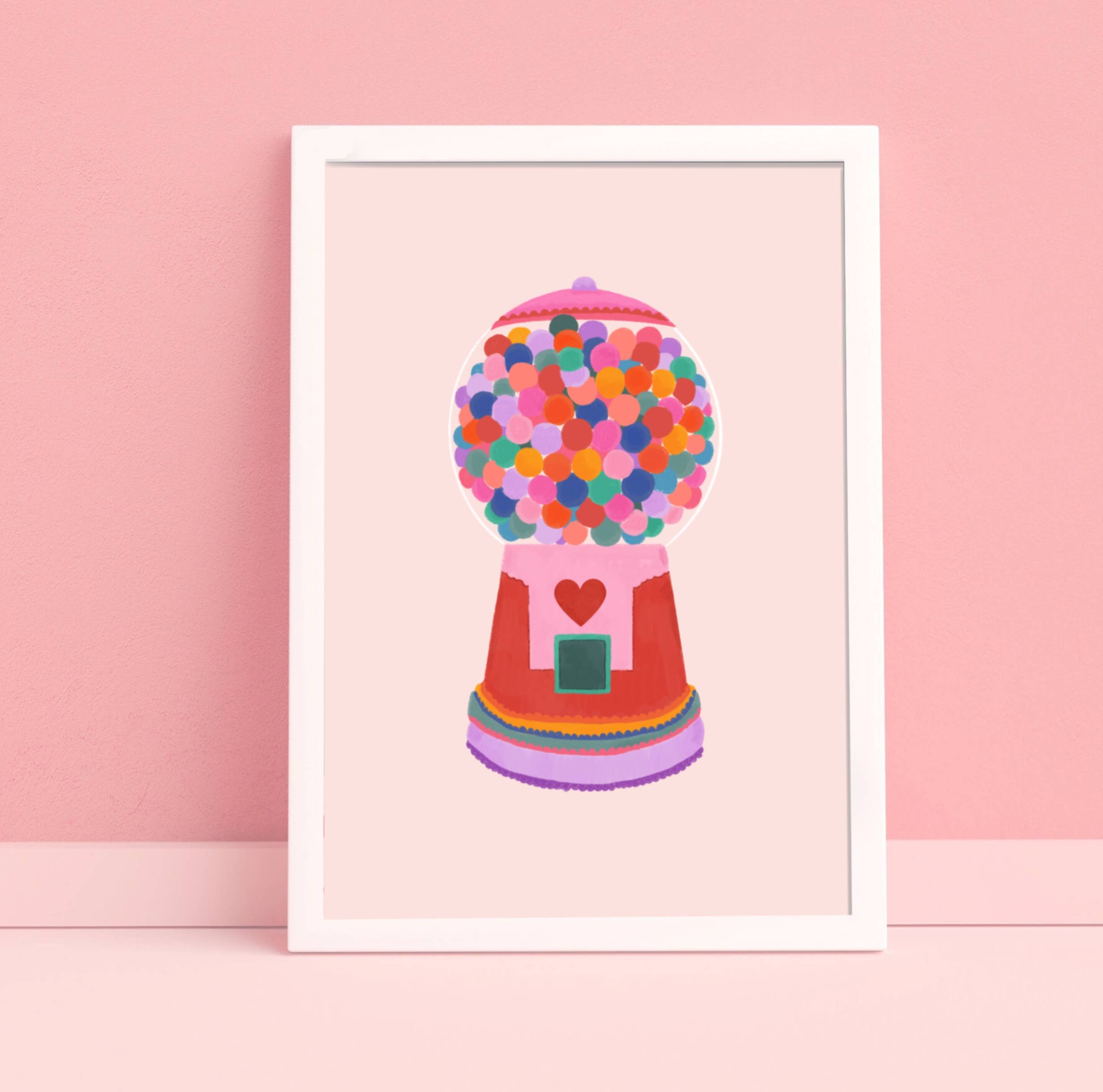 Bubble Gum Hand Drawn Art Print. Perfect for a colourful touch to any room!