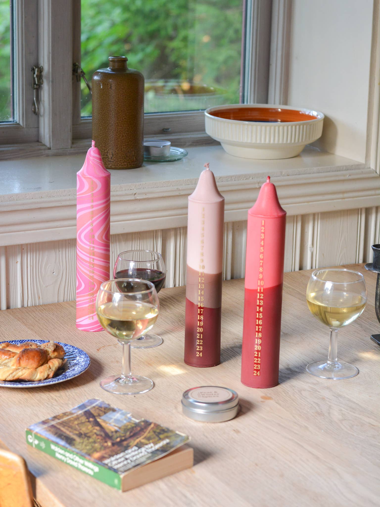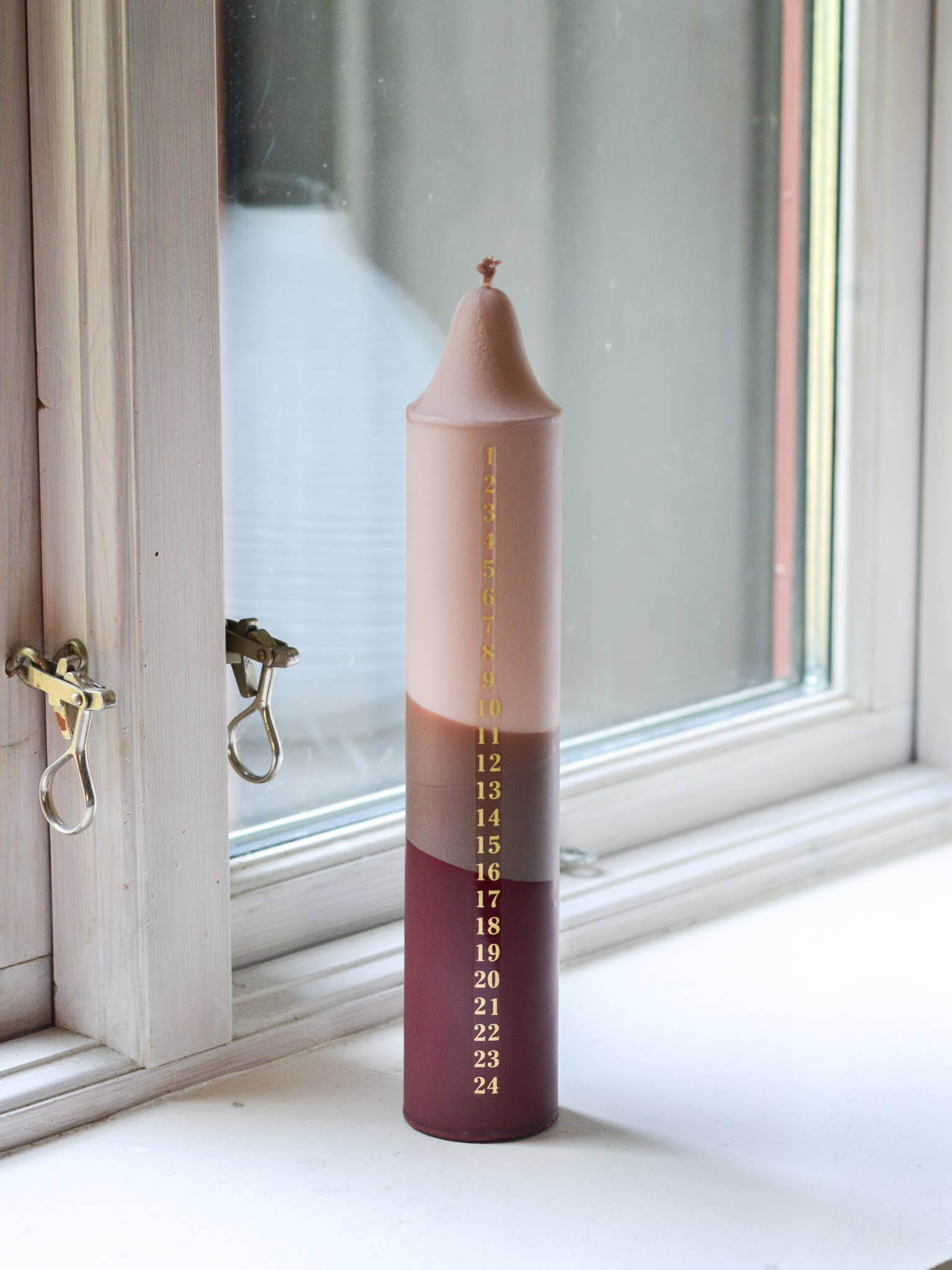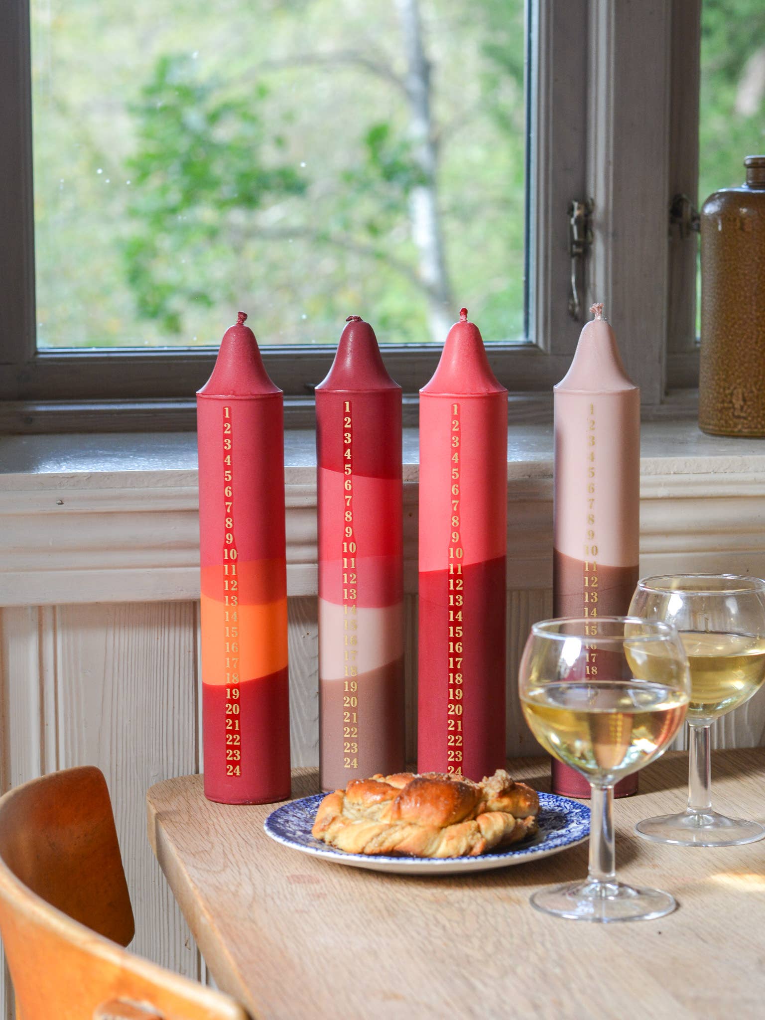 Une bougie de l'Avent originale scandinave et danoise. Chaque bougie est numérotée avec soin, marquant le compte à rebours jusqu'à Noël. Allumer une bougie par jour est un rituel joyeux qui fait grandir l'excitation et l'impatience à l'approche des fêtes. Les bougies sont fabriquées à partir de cire végétale naturelle à base de stéarine, et toutes les couleurs et décorations sont réalisées à la main avec des matériaux naturels et adaptés à la combustion.