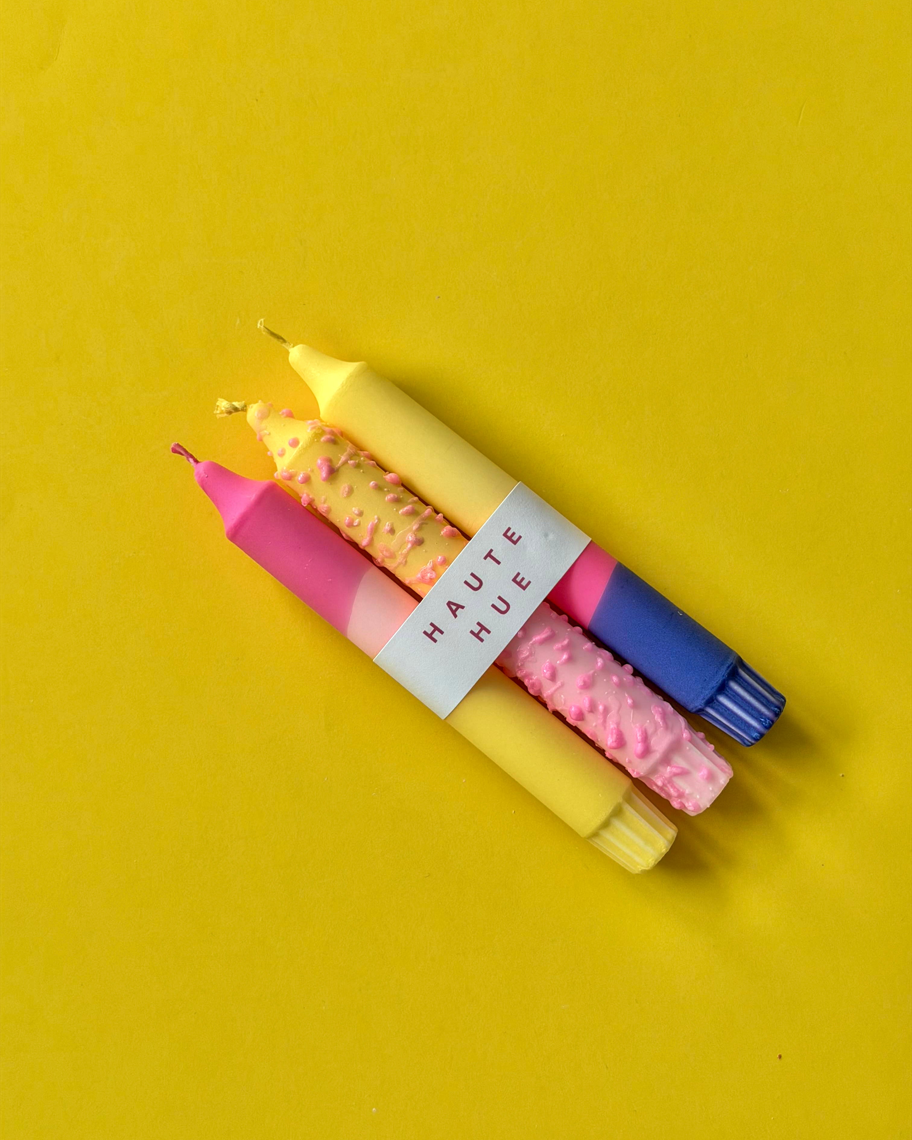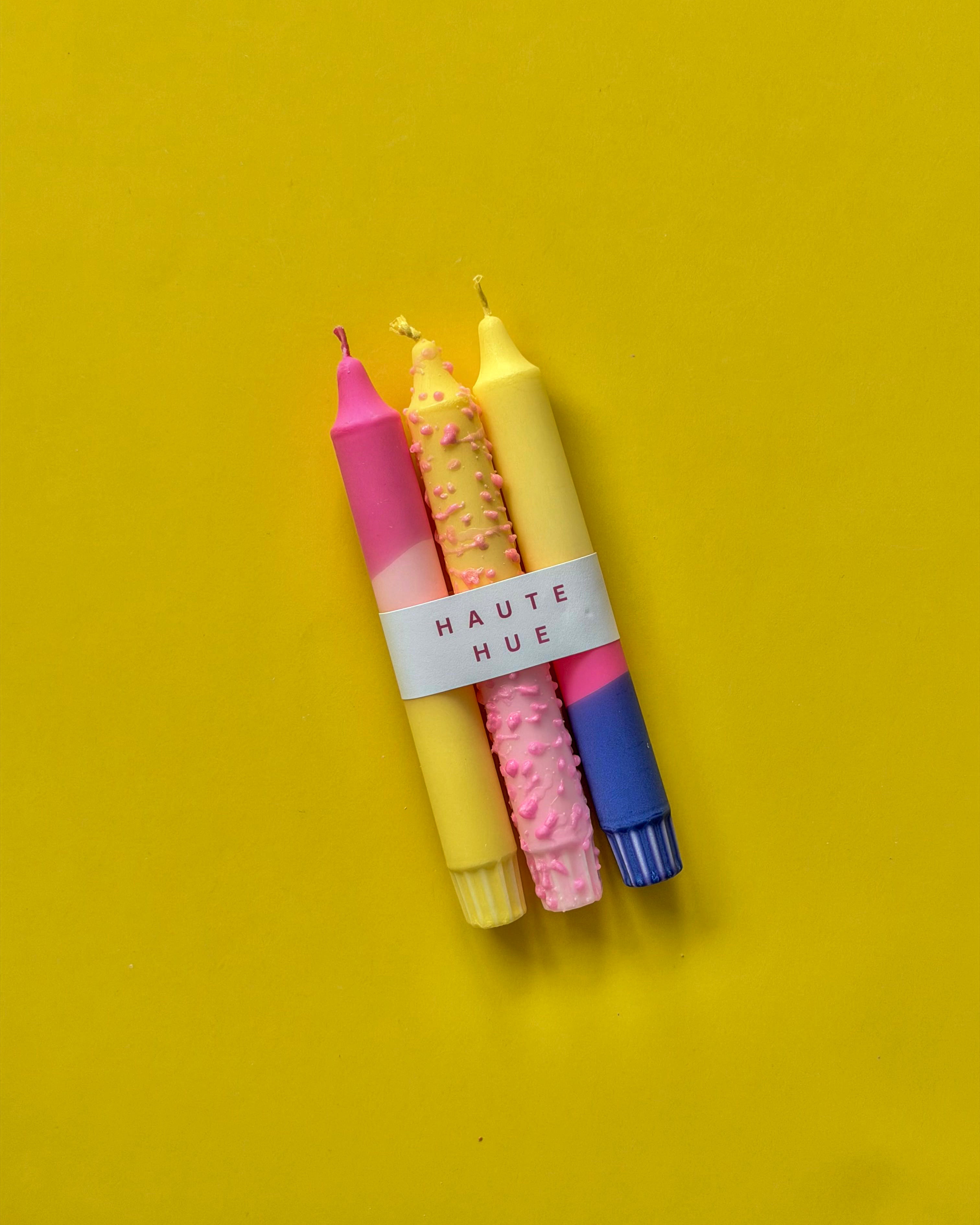 Comme un coucher de soleil fait de sorbet et de paillettes, le mélange Sorbet Sunset réunit trois bougies coniques ludiques aux teintes rose vif, jaune soleil et une bougie centrale texturée de paillettes pour une dimension supplémentaire. Disposez-les ensemble sur une table ou répartissez-les dans votre espace pour de petites touches de couleur qui créent une ambiance douce, délicate et joyeusement maximaliste.