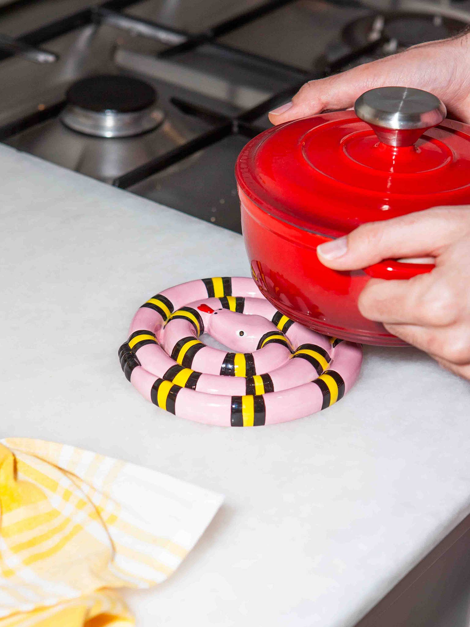 Protégez vos surfaces avec une touche d'originalité. Ce dessous de plat en céramique rose en forme de serpent est audacieux, amusant et totalement inattendu !
