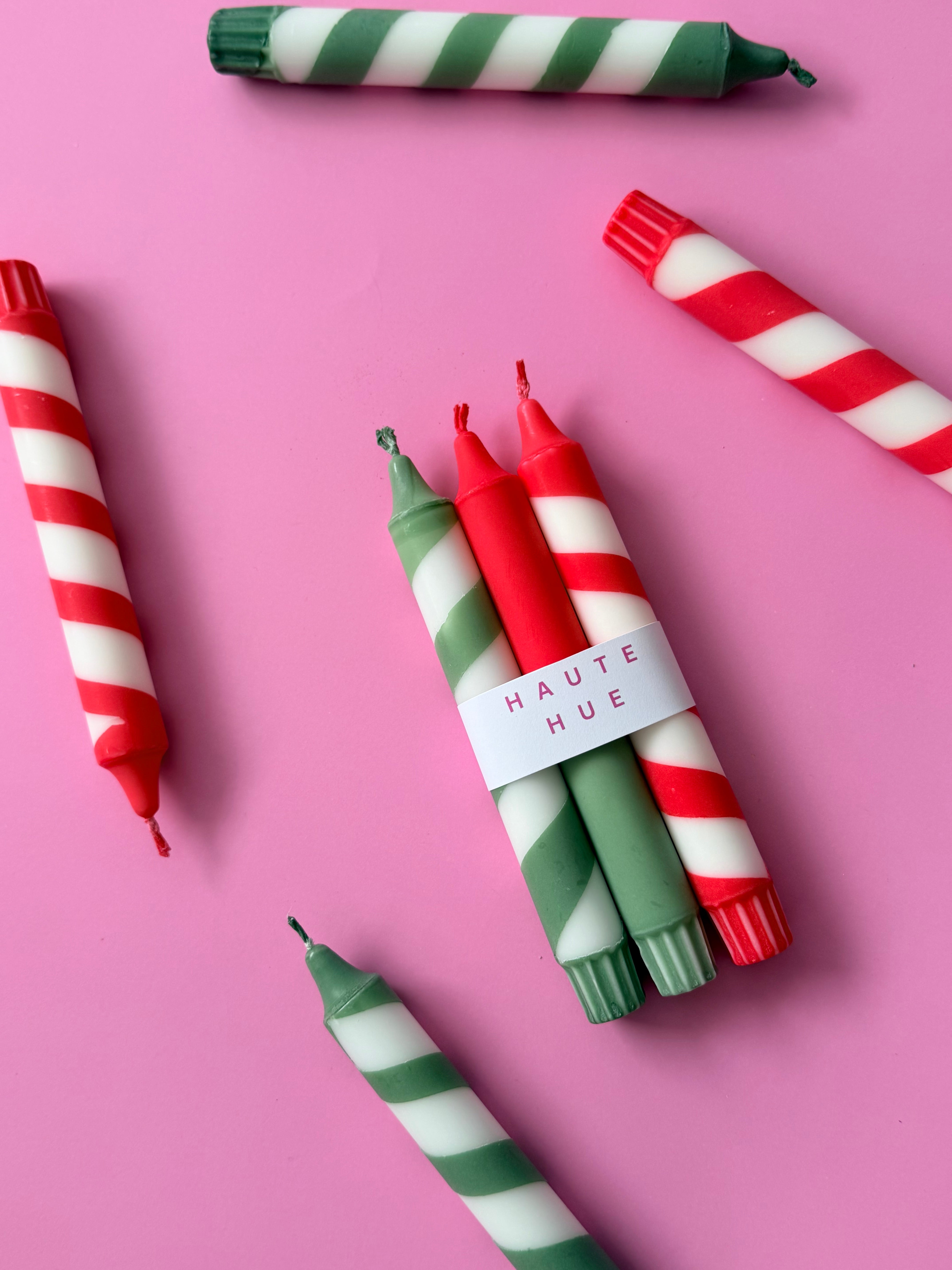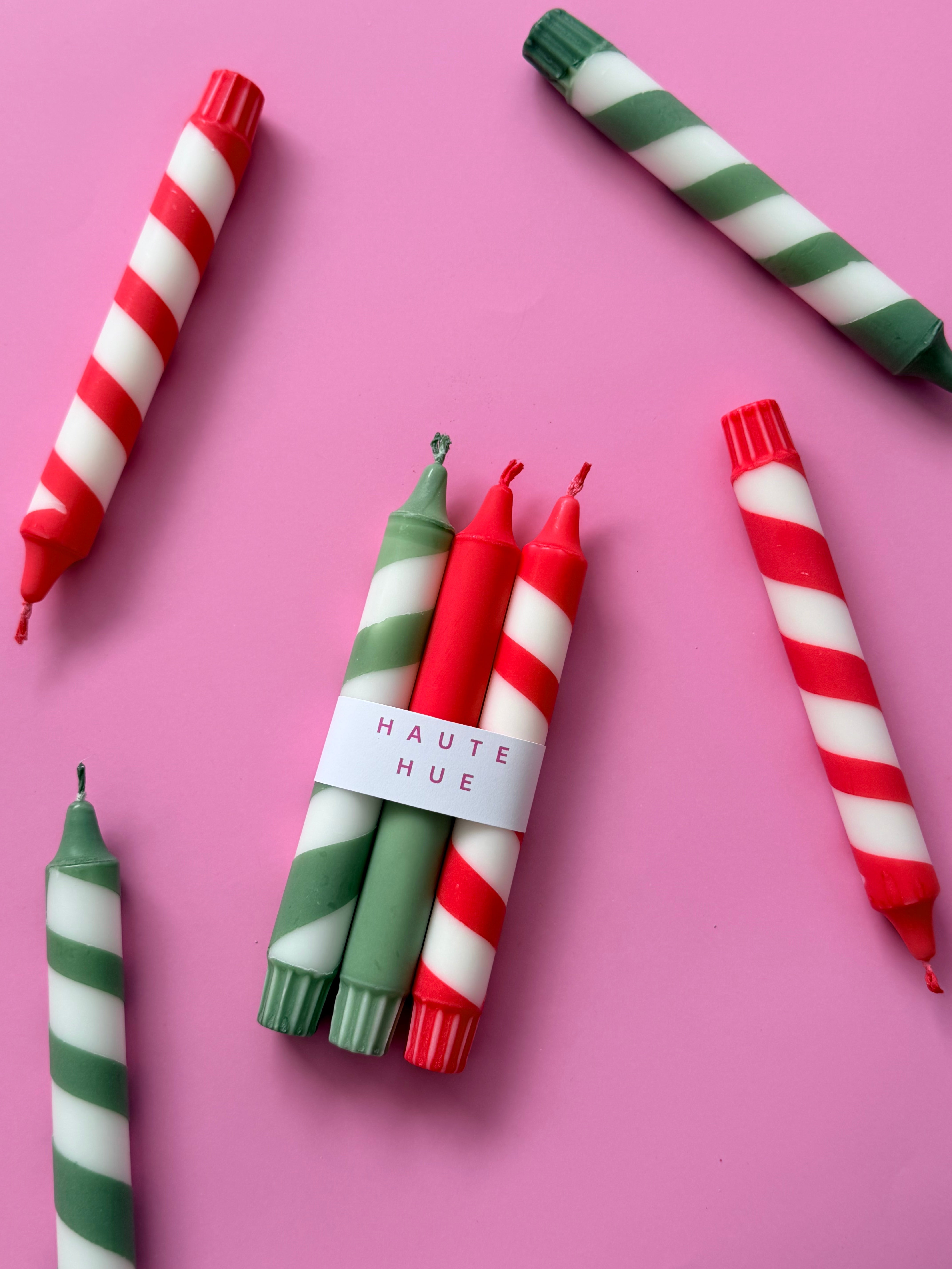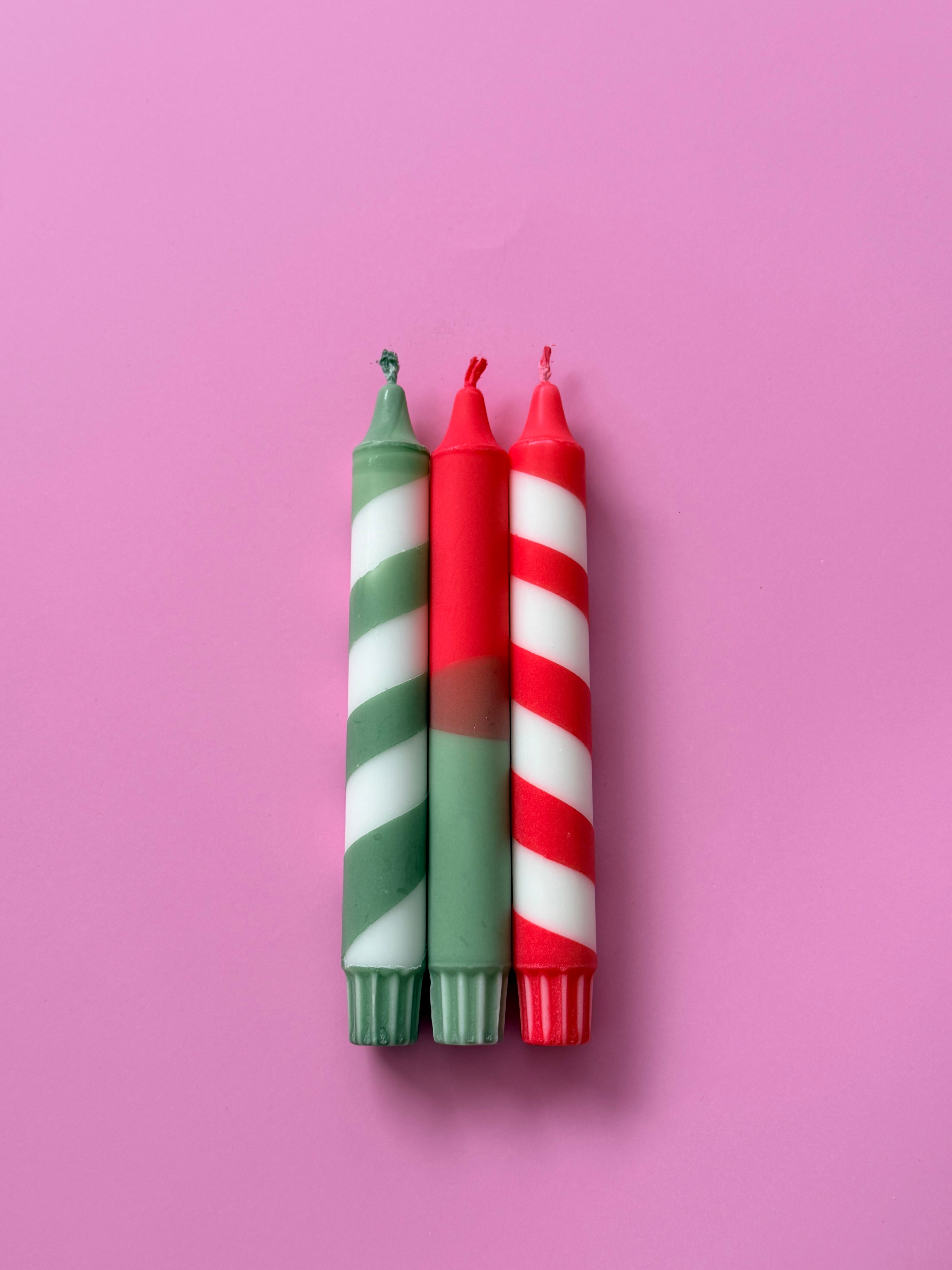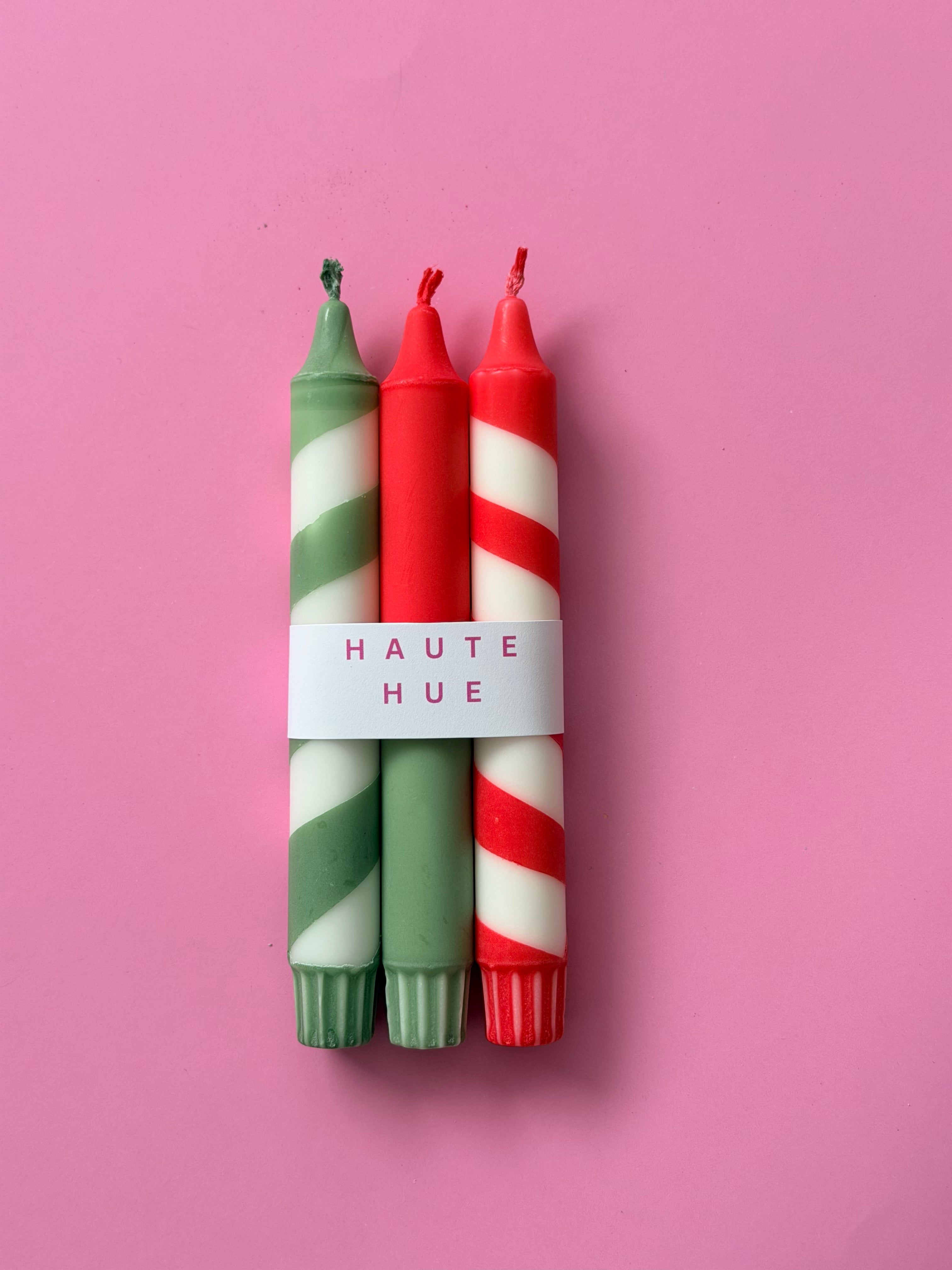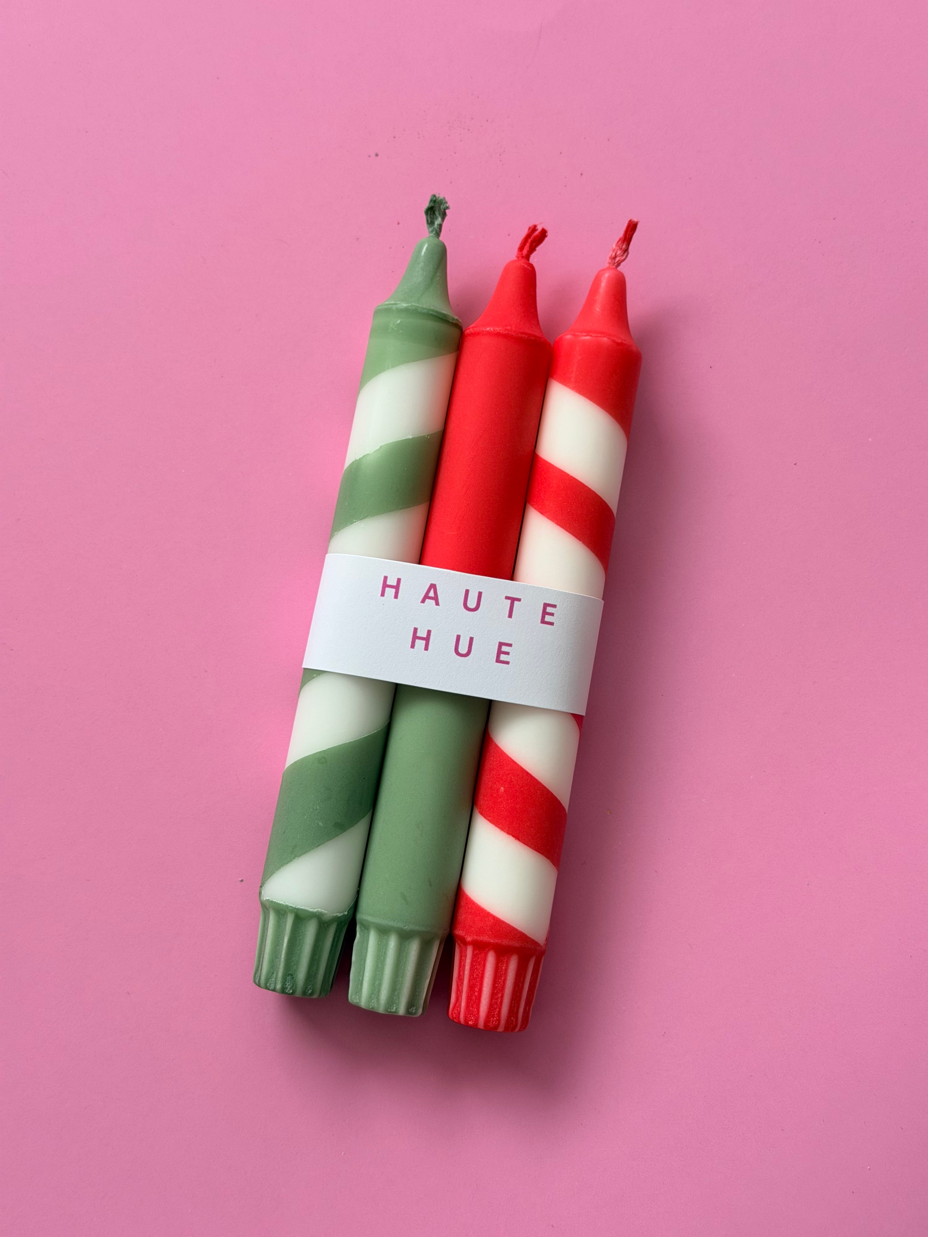 The Holly Jolly Mix Taper Candle Set includes three dip-dyed stearin wax tapers: a green-and-white candy-cane stripe, a red-and-white candy-cane stripe and a red-and-green colour-block candle for a classic Christmas red and green palette. Think of them as your candle holders’ Christmas party outfits—festive, bold and impossible to ignore!