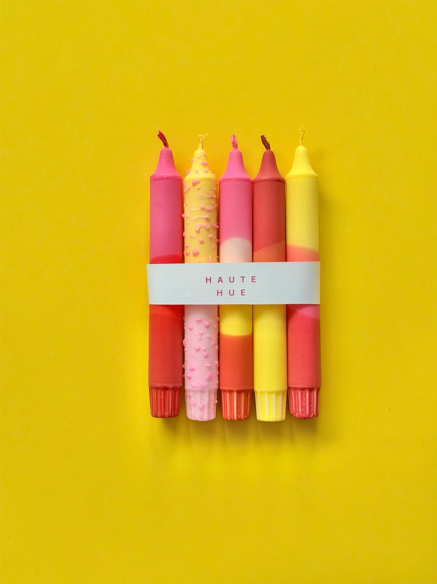 Summer Sunshine is a happy little burst of summer for your table. This bright set of five colorful taper candles mixes juicy pinks, corals, and sunshine yellow, with playful gradients and sprinkle-like texture for that “dessert for your décor” vibe. Perfect for adding instant mood to dinner parties, birthdays, brunches, or everyday shelves that need a pop.
